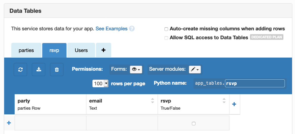 We’re also using Anvil’s Data Tables to store our parties and rsvps, and our tables look like this: