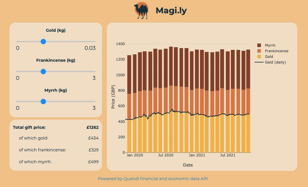 On last year’s advent calendar, we had an app that visualised the prices of gold, frankincense and myrrh, which allowed us to get incredibly valuable financial insights. For this year I decided to give the app a facelift and, while at it, I also updated the prices of frankincense and myrrh, to see how the market of Christmas’s three hottest commodities has evolved in a post-Brexit UK.