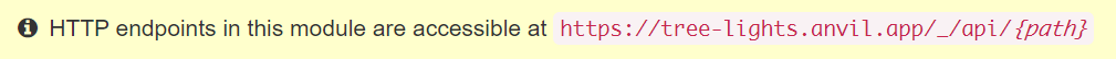 req = json.loads(anvil.server.request.body.get_bytes())My app is at https://tree-lights.anvil.app, so this API endpoint will be https://tree-lights.anvil.app/_/api/alexa. Yours will be something different, of course - check the bottom of your Server Module window for the address: