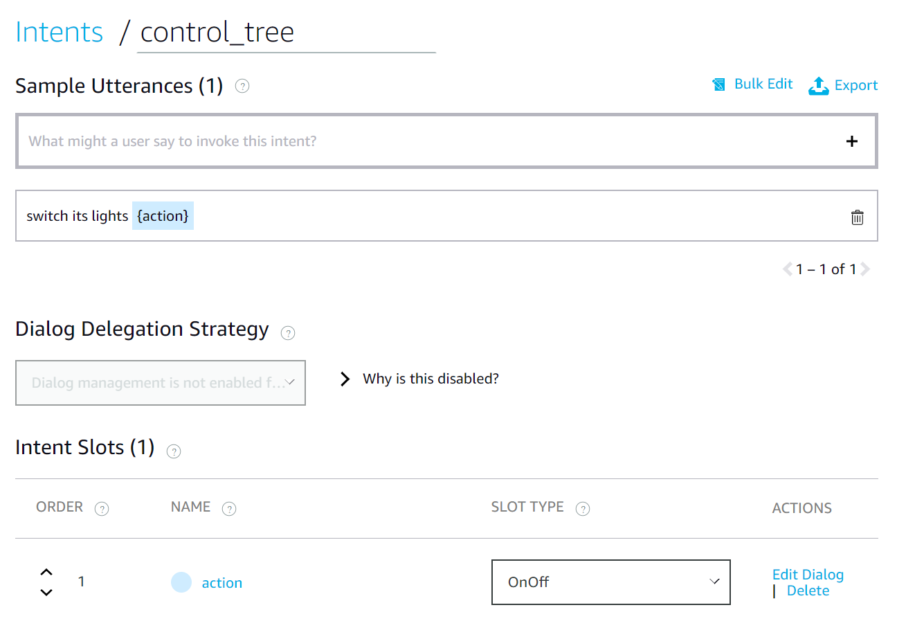 Next, add an Intent (call it something like “control_tree”), and add a Sample Utterance of “switch its lights {action}”. Create a new Slot Type called something like “OnOff”, give it two possible values (“on” and “off”) and then set the type of the “{action}” slot to OnOff. Now Alexa will understand full commands like “Alexa, ask the Christmas tree to turn its lights on”. She’ll even be clever enough to spot that the value of the action slot is “on”.