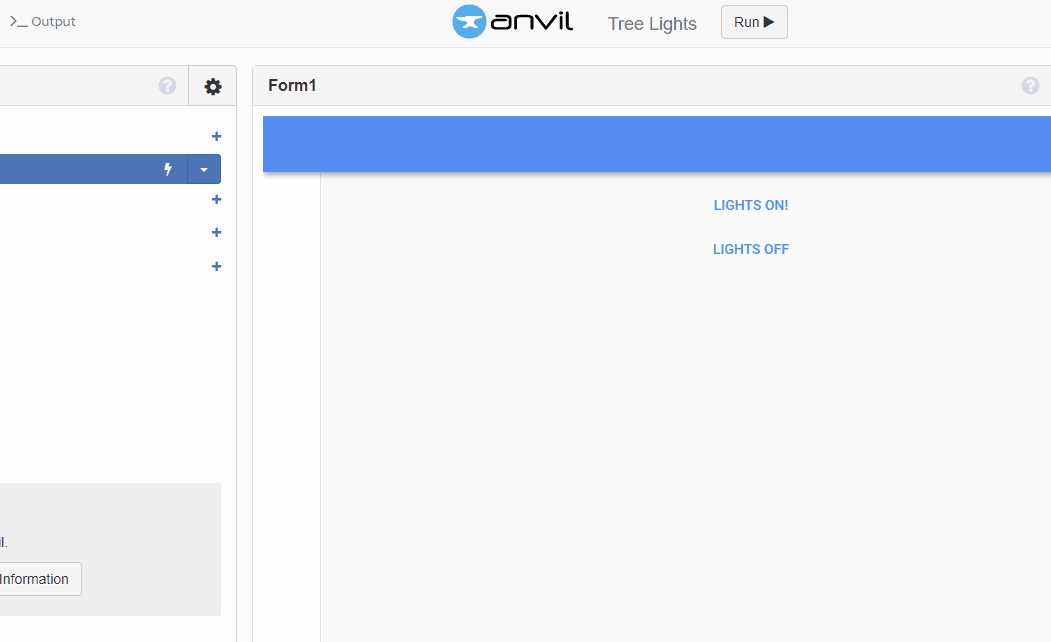 anvil.server.call("lights_on")Add a similar call to "lights_off" for the other button, and that’s it! Run your app, and control your tree! Or send the URL to a loved one you can’t visit this year, so they can do it from there: