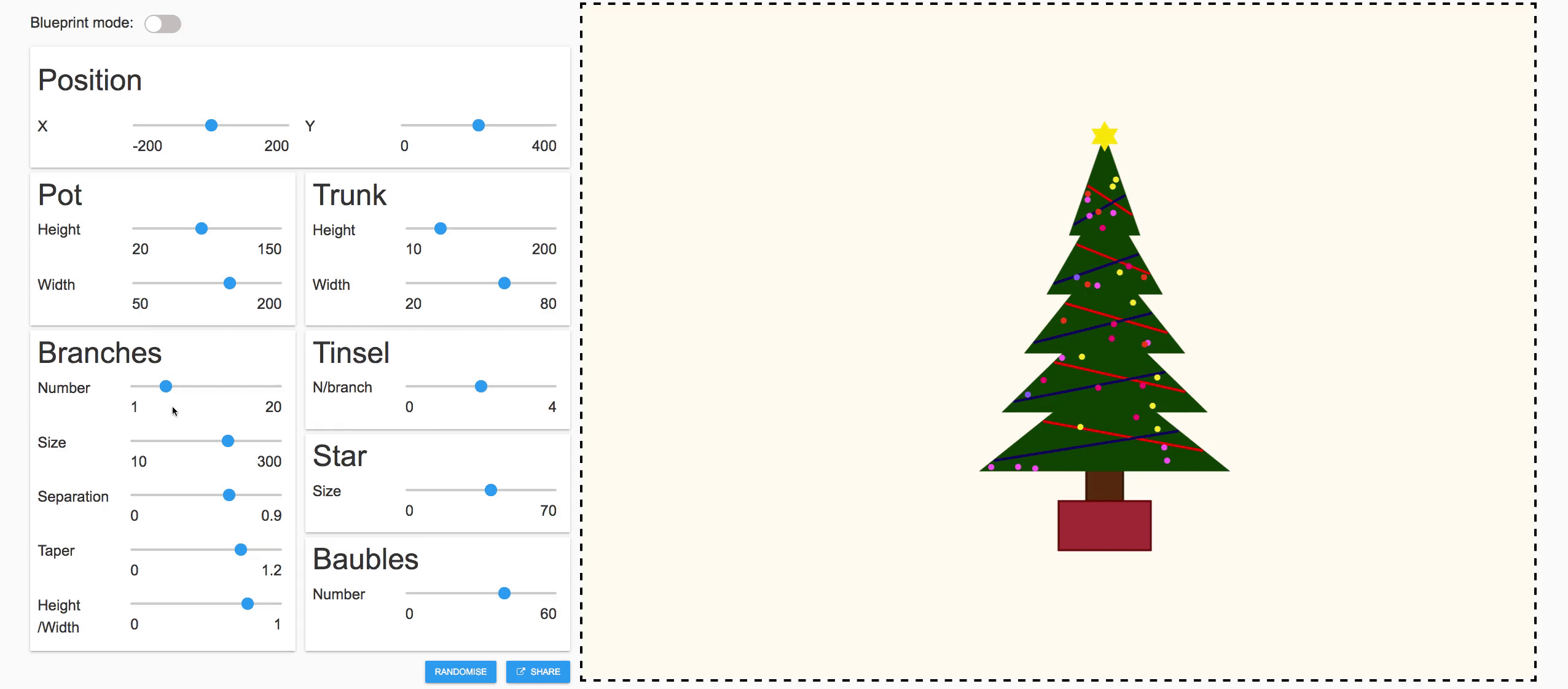 It’s a procedural Christmas tree generator. Send your creation to your friends!