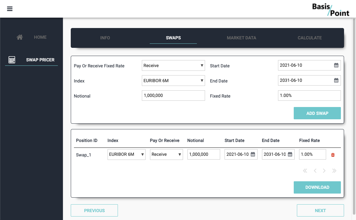 In the app, swaps are added then displayed using a Data Grid to create a simple swap portfolio.