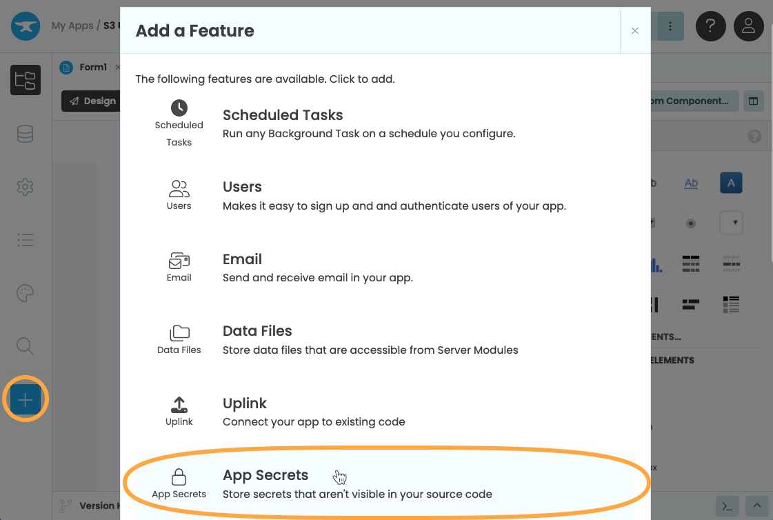 First, log into Anvil and create a new blank app. We’ll need to make use of our app’s App Secrets to store the AWS access keys that we’ll acquire in the next step, so ahead and add the App Secrets service to your app.