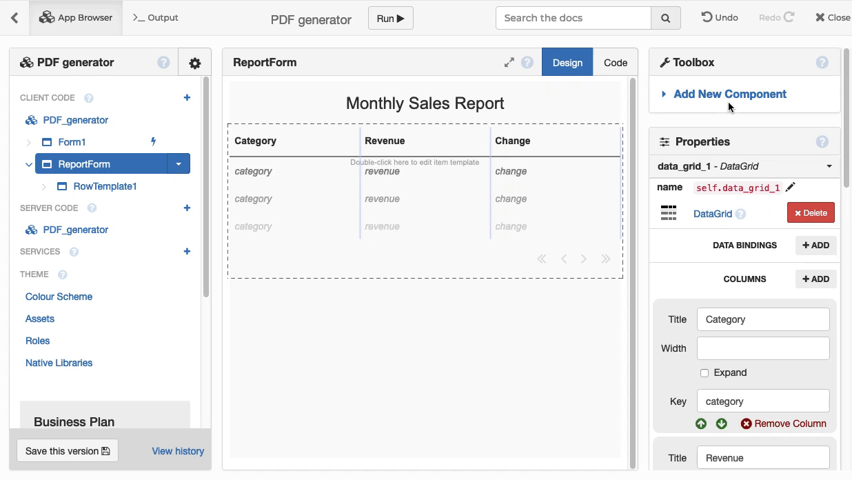 We want to display a table, with each category of revenue and its growth/decline since last month. So we drag a Data Grid onto our page, and give it three columns: Category, Revenue, and Change, displaying the dictionary keys category, revenue and change.