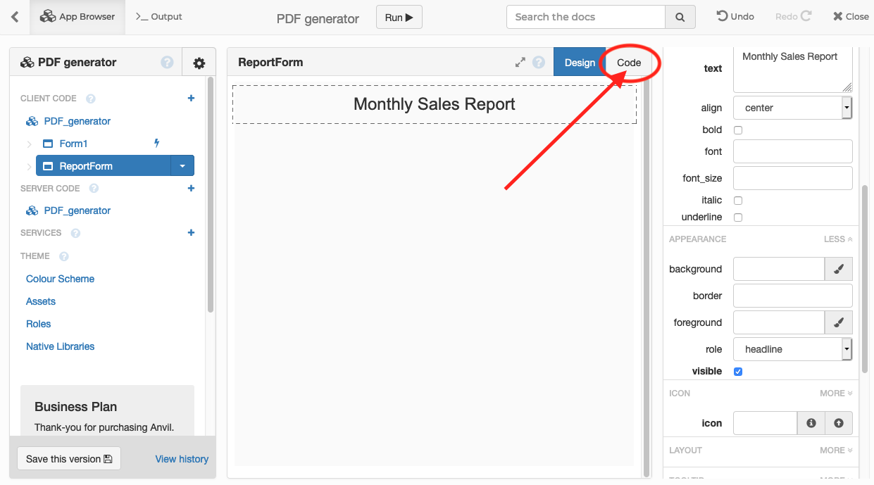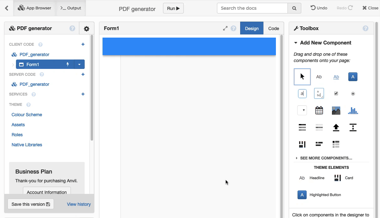 To design our PDF, we first open the Anvil cloud editor, and create a new app, choosing the ‘Material Design’ theme. We’ll want to create a “Form” - that’s a piece of web UI - which we will then turn into a PDF.
