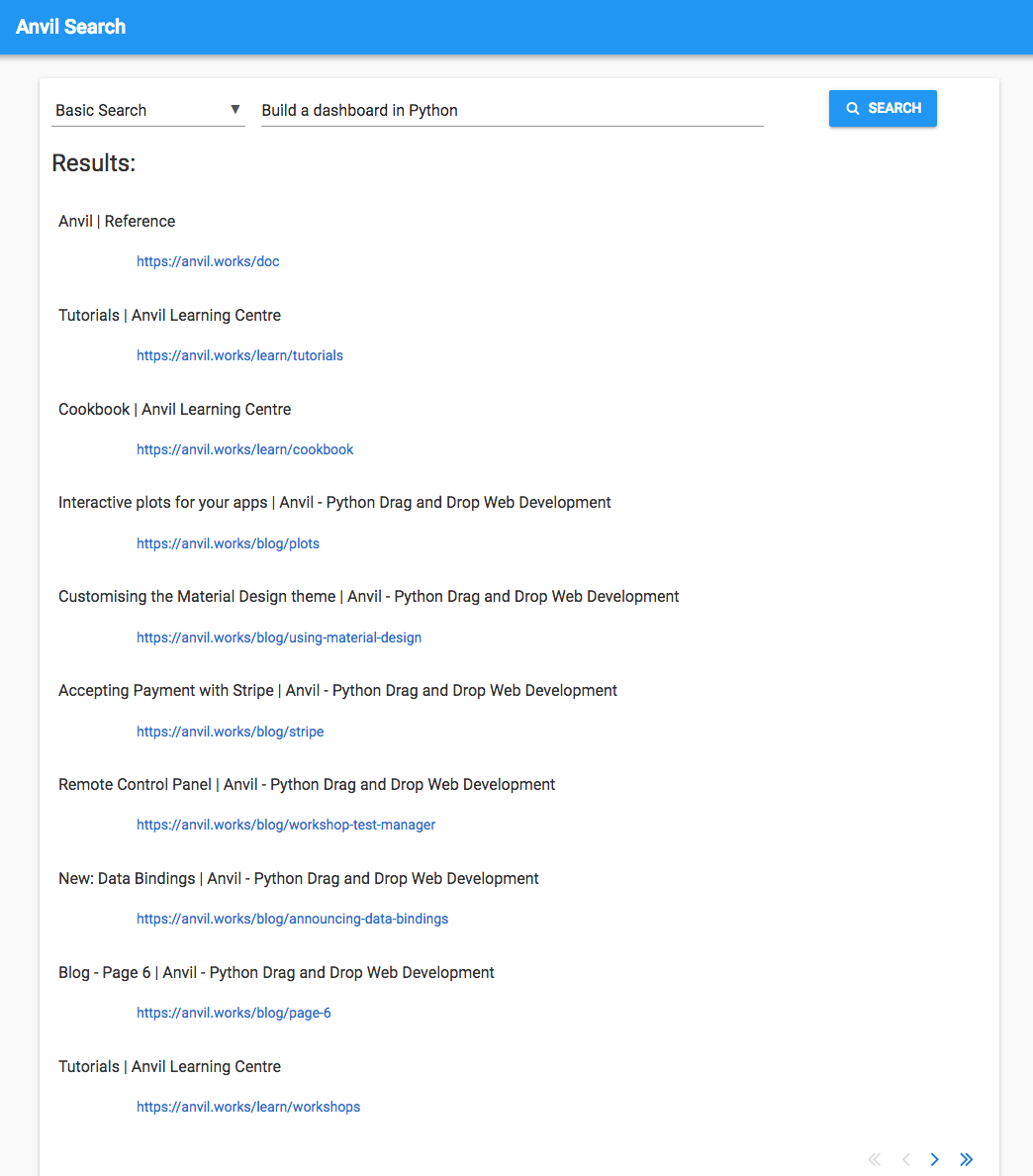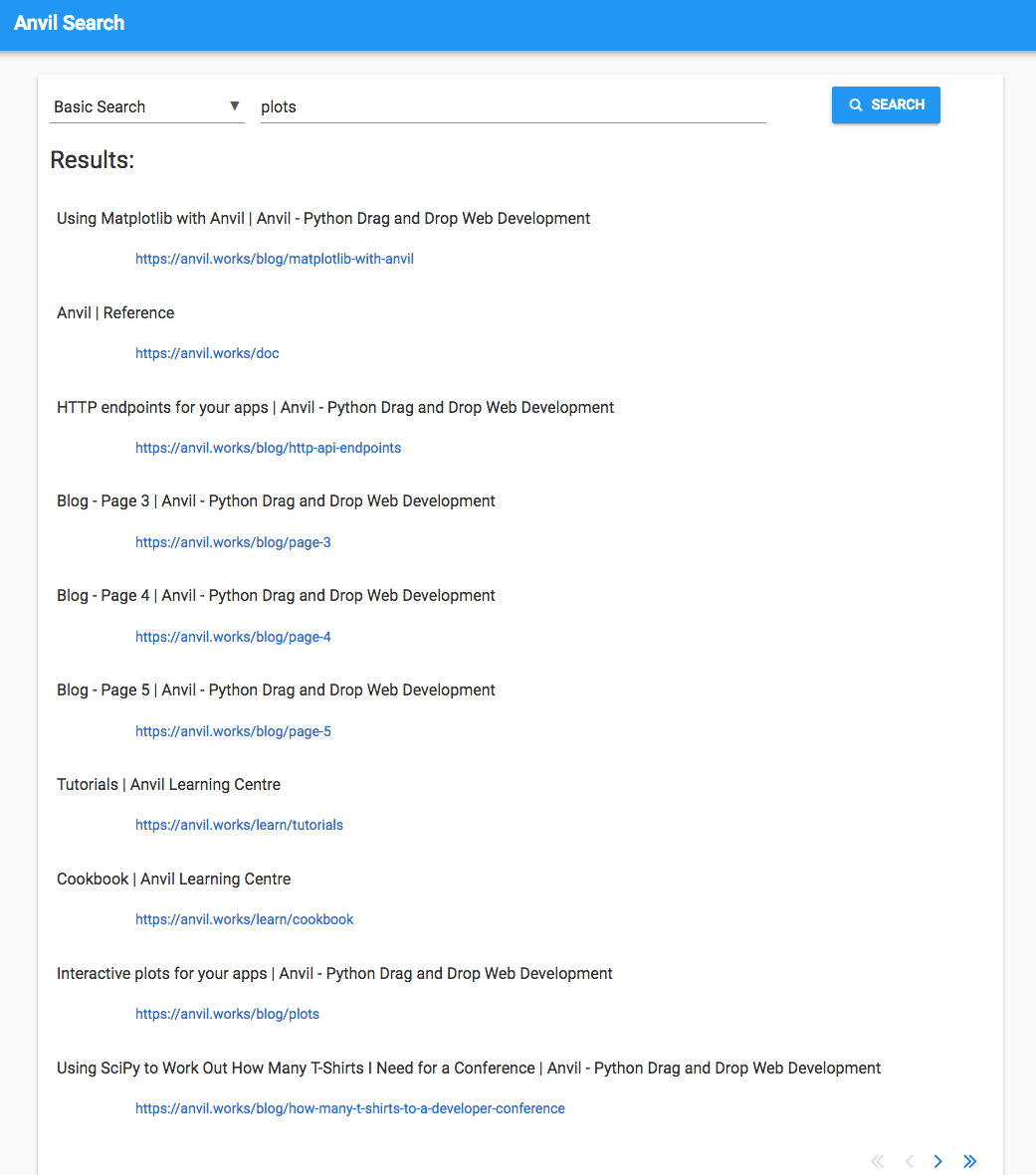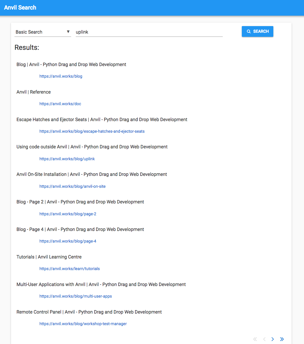 (If you’re wondering why all the results are from the same site, bear in mind that I’ve restricted my crawler to https://anvil.works to avoid getting my IP address quite legitimately blocked by anti-DoS software, and to keep my test dataset to a manageable size.)
