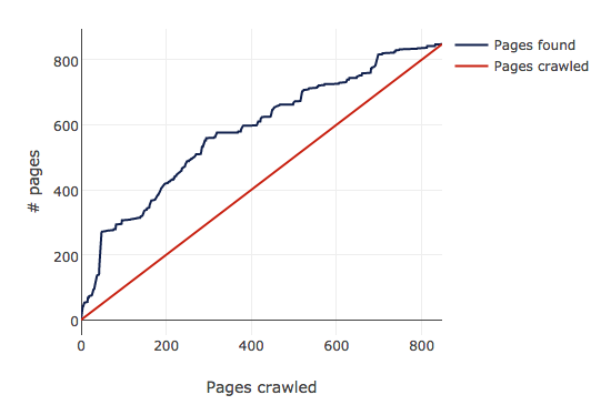 title = str(soup.find('title').string) or 'No Title'The crawler has become rather like the classic donkey following a carrot: the further it gets down the URL list, the more URLs it finds, so the more work it has to do. I visualised this by plotting the length of the URL list alongside the number of URLs processed.