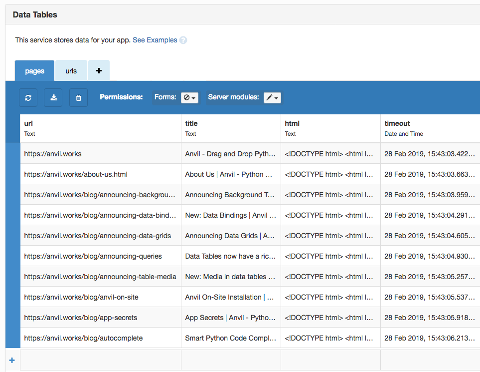 app_tables.urls.add_row(url=url)I’ve also made it possible to submit sitemaps, which contain lists of many URLs (see our Background Tasks tutorial for more detail.) I’m using BeautifulSoup to parse the XML.
