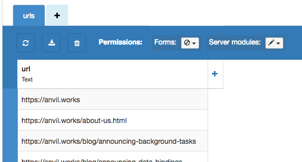 I need a known URL to start with. I’ll allow webmasters and other good citizens to submit URLs they know about. I’ll store them in a database (I’m using Anvil’s Data Tables) and if I know the URL already, I won’t store it twice.