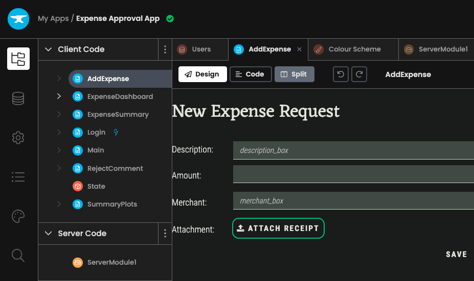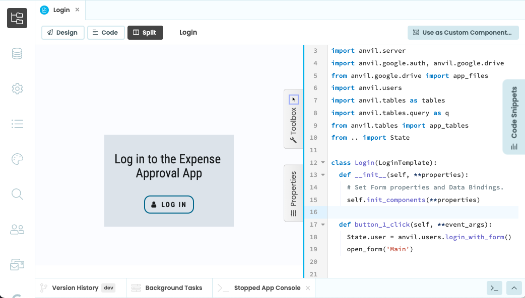 With the new Anvil Editor, you can view your client code and UI design side-by-side. You can now write Python code and tweak your UI without the need to switch back and forth. You can now also run your app in split view so you can build your app and view your live app in the same screen.