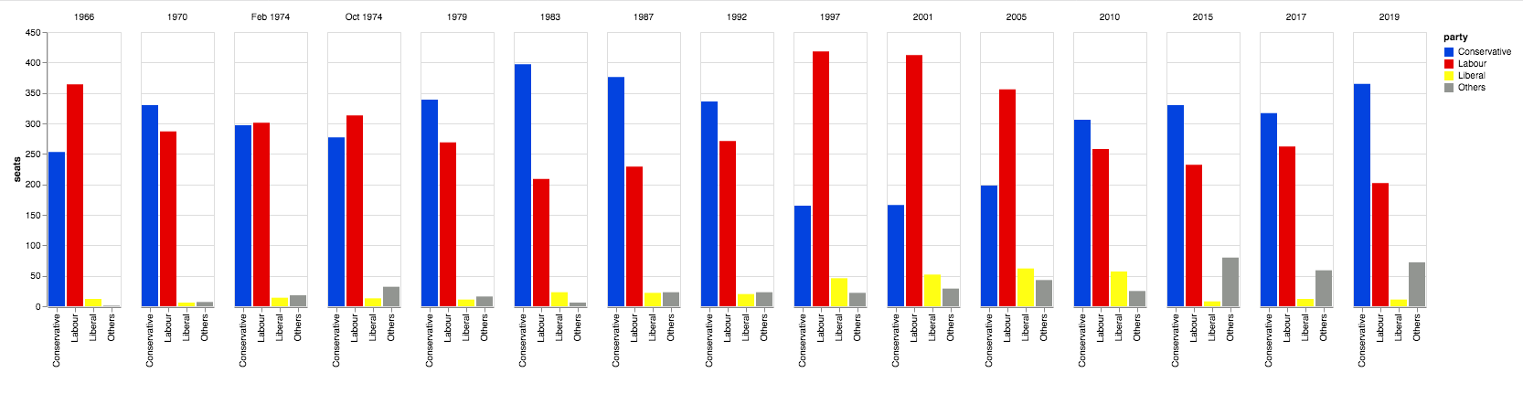 Each of these libraries takes a slightly different approach. To compare them, we’re going to make the same plot with each library, and show you the source code. I’ve chosen a grouped bar chart of British election results since 1966. Here it is:
