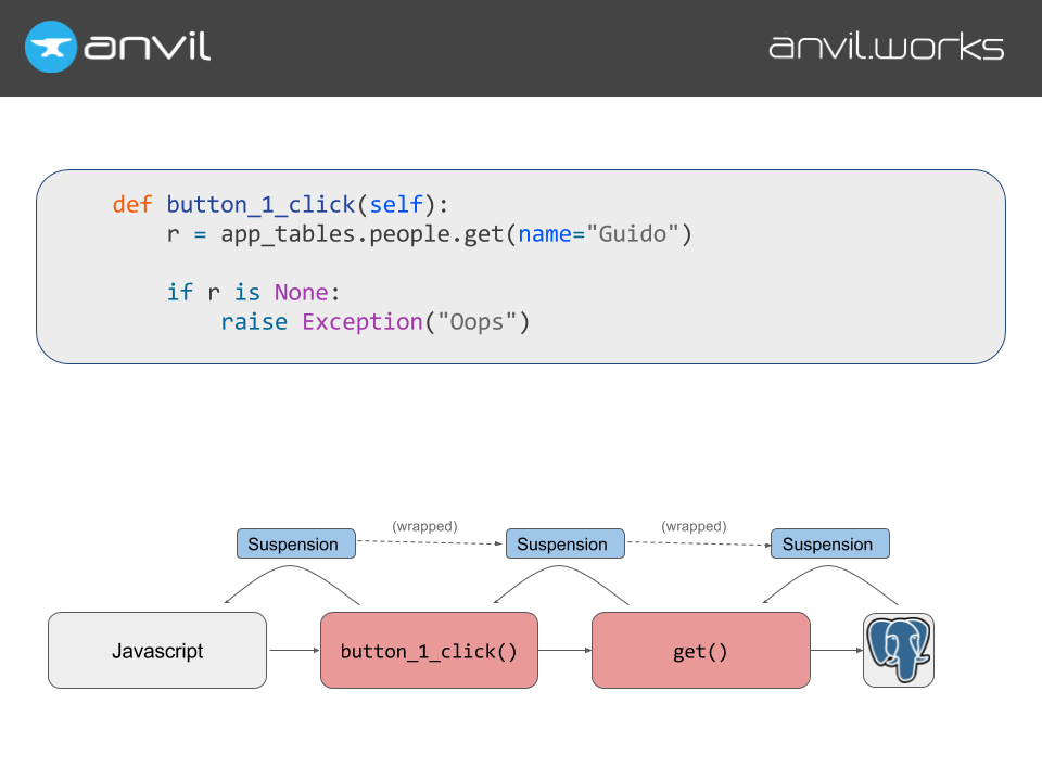 So, this is what we need to modify to implement blocking code. We invent a new Javascript class that a function can return, to say “hey, I’m returning, but I’m not done yet; I’ve just blocked”. We call this a suspension.