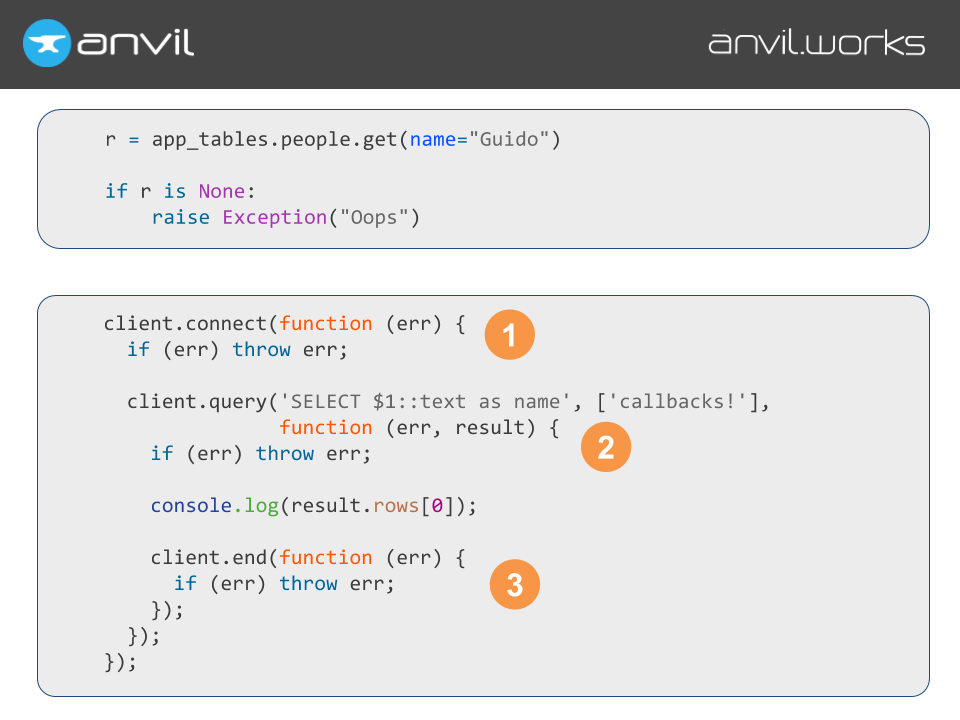 And here’s how you’d do it in Javascript. I count three separate callbacks here. I’m not exaggerating - this is an example straight from the documentation of the postgres library!