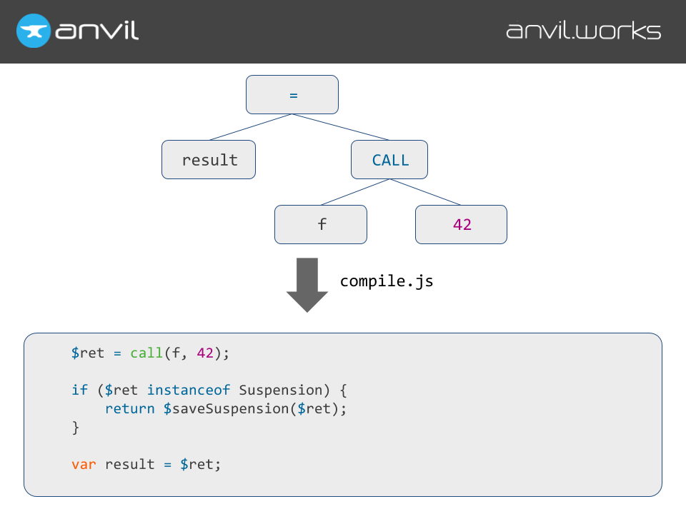 So, when we’re compiling the AST, wherever we’re compiling a function call, we generate Javascript code that calls the function, and looks at the return value, and says, “is it a Suspension?”. Because if it returned a Suspension, we’re blocking - and I’m going to have to suspend myself. We save all our variables and temporary values, our exception state, and where we are in the function, and then we return our own suspension with all that information in it.