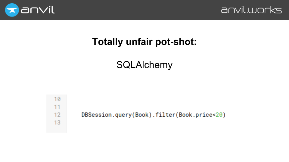 Let’s take an entirely unfair pot-shot at SQLAlchemy, which is a library that manages the transformation of an SQL database into Python objects (and back). It’s actually really good at it. You can even write neat query expressions like this: filter(Book.value<20).