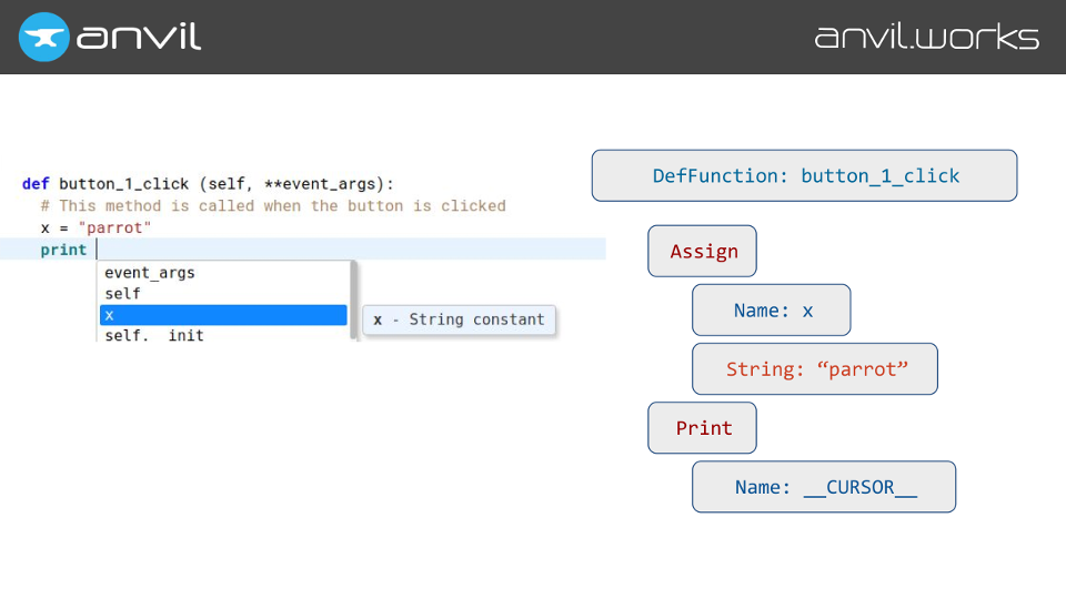 Conveniently, because Anvil runs all your client-side Python code in the browser, we have a Javascript parser for Python just lying around the place. (We use the open-source Skulpt project.)