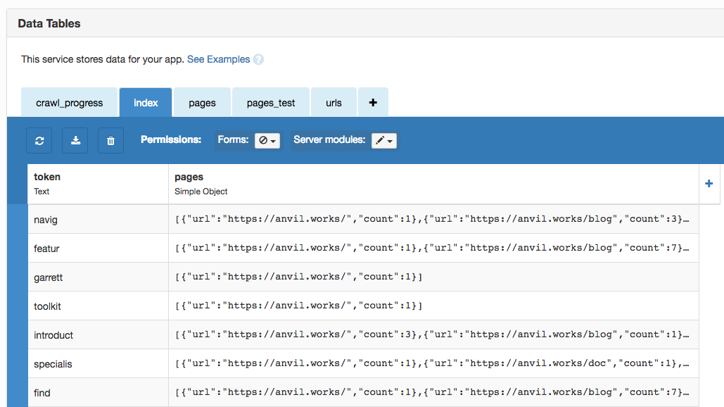 app_tables.index.add_row(token=token, pages=pages)That second for loop writes the index to the database. It’s much faster to build the index in-memory and