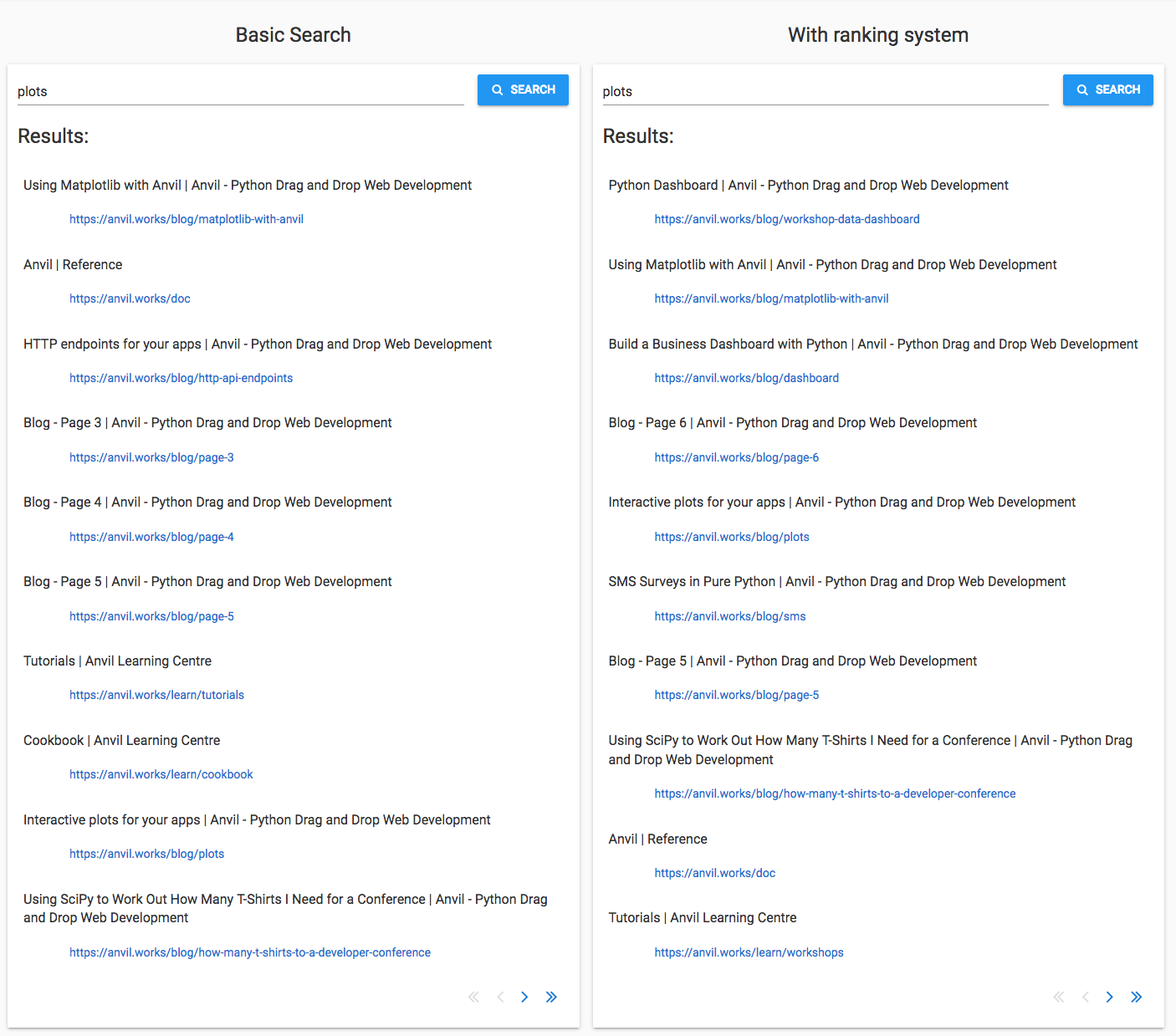 I’m building a search engine using Anvil. So far I’ve built a Python web app that crawls the web downloading pages. I’ve also implemented PageRank so my app surfaces the most important pages.