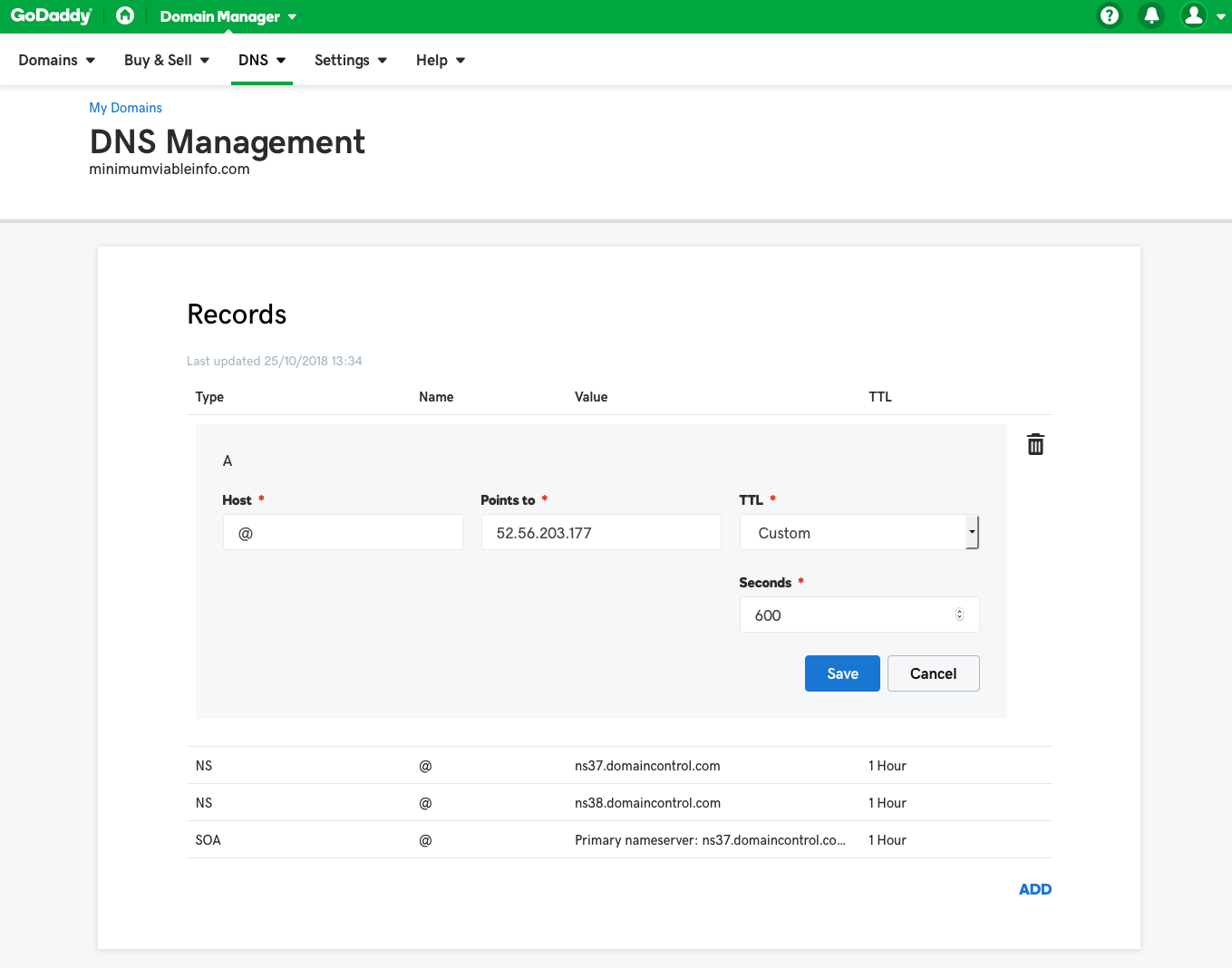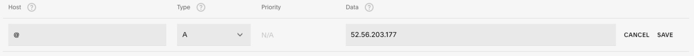 Next, create a DNS A record pointing your domain to 52.56.203.177. If you wish to use a subdomain of the domain you purchased (such as app.mydomain.com), you can simply configure an A record pointing that subdomain