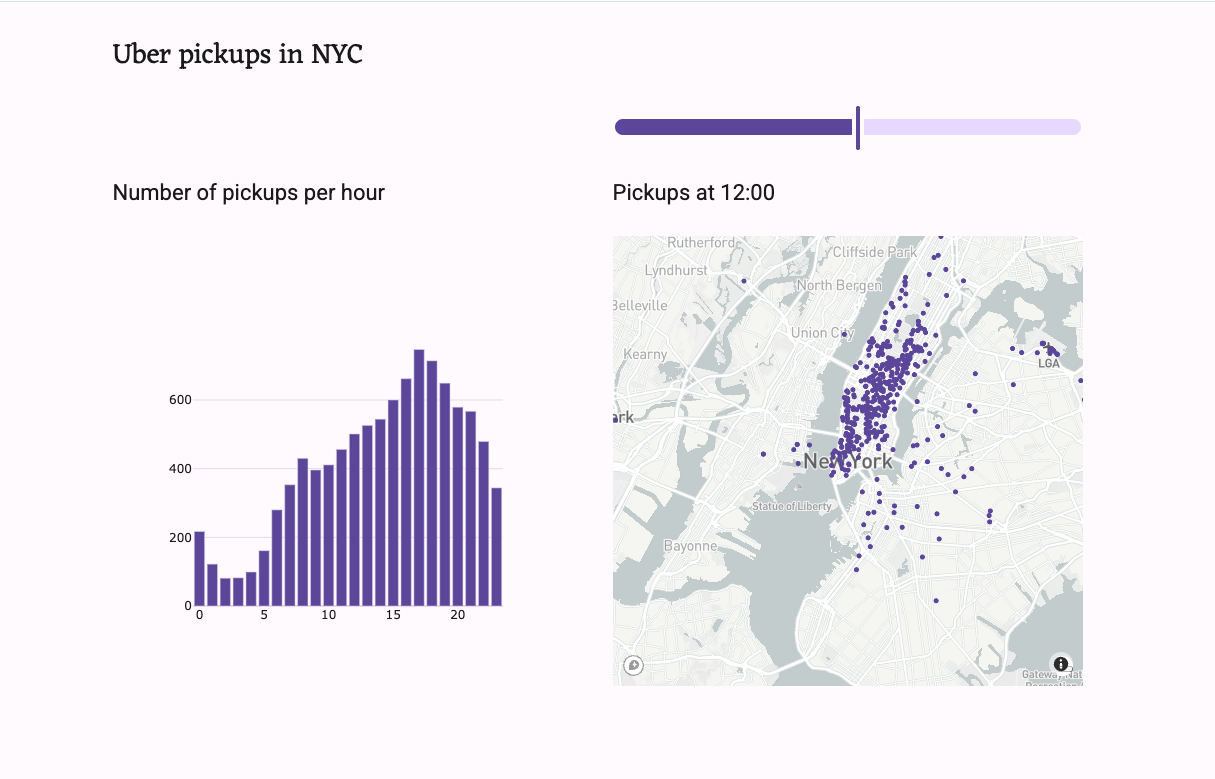 Here’s a simple dashboard app built in Streamlit. It imports data on Uber pickups in NYC in 2014 and plots the number of pickups per hour in a bar chart and a map.