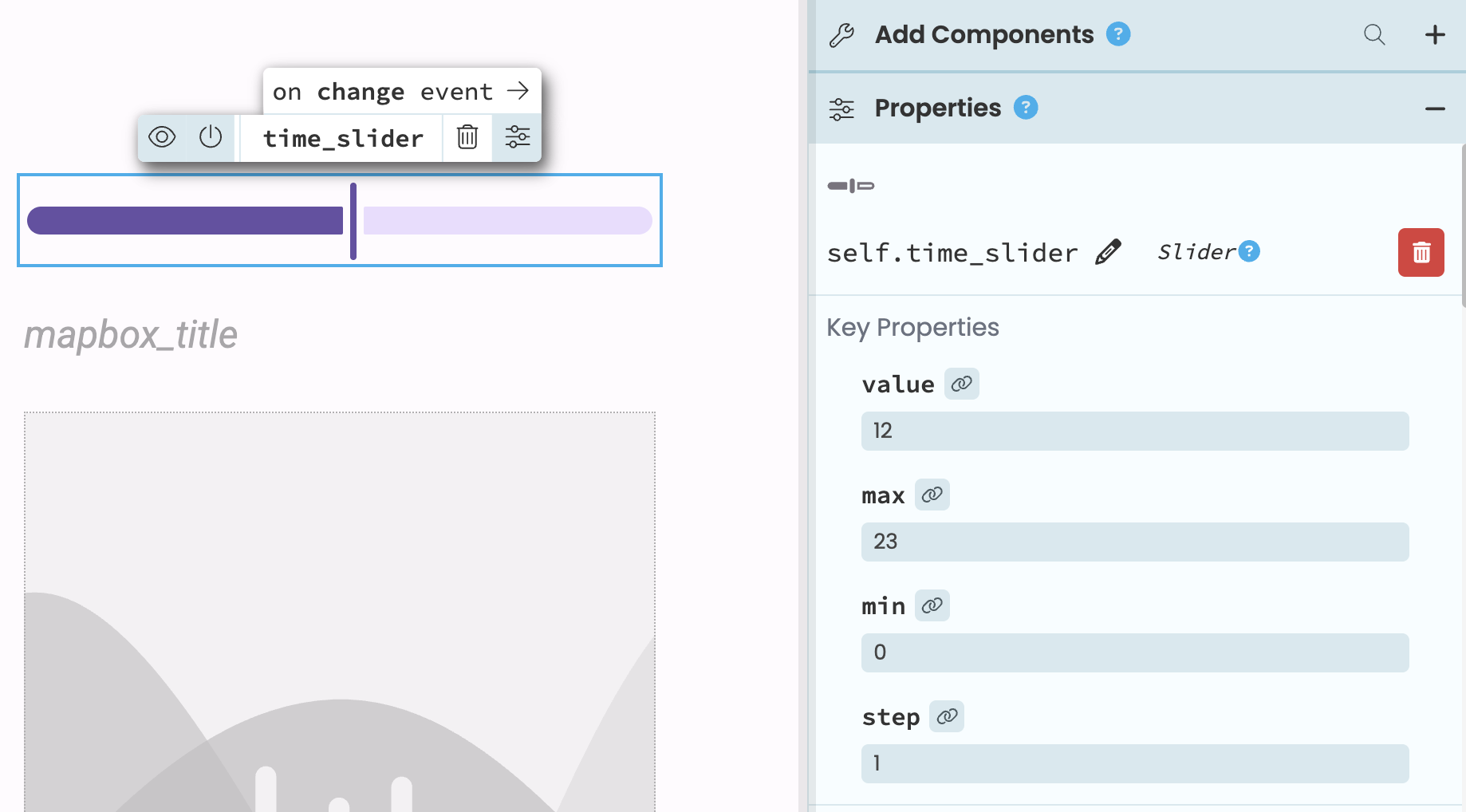 self.mapbox_map.layout.margin = dict(t=0, b=0, l=0, r=0)Now we just need our Slider to control what data appears on the map. From Design view, click on the Slider and scroll to the bottom of the Properties Panel to find all the events available for this component. Click on the arrow next to change_end to set up an event handler that will run when the user releases the Slider. In the function that was automatically created, we’ll get the current value of the slider, set the Header text and display the map data on our plot: