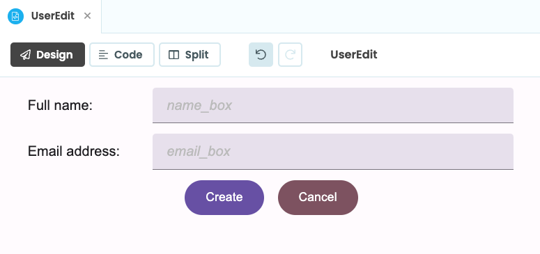 For example, take the ‘UserEdit’ Form above. All this Form does is record user inputs using Data Bindings – no CRUD operations or logic are stored in the Code of the ‘UserEdit’ Form. Since the Form is only responsible for taking user inputs, we can use it to both Create and Update user records.