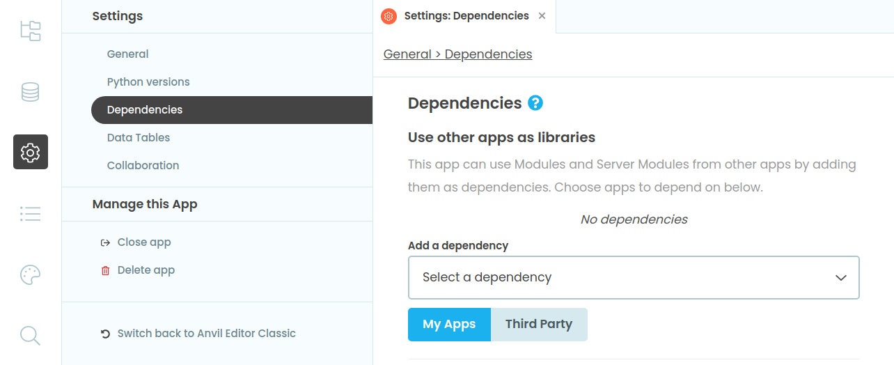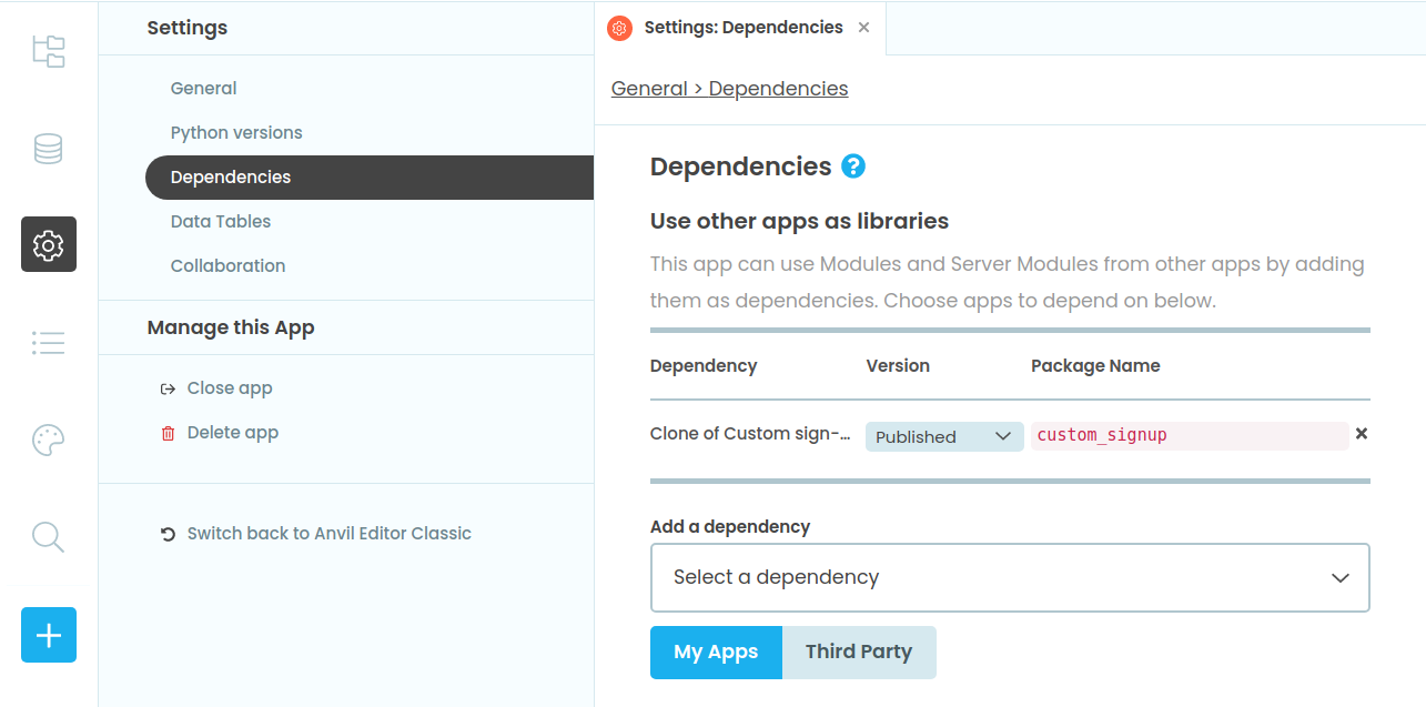 Next, we’ll add the app you just cloned as a dependency to an existing app. Log in to Anvil and open the existing app that you’d like to customise.