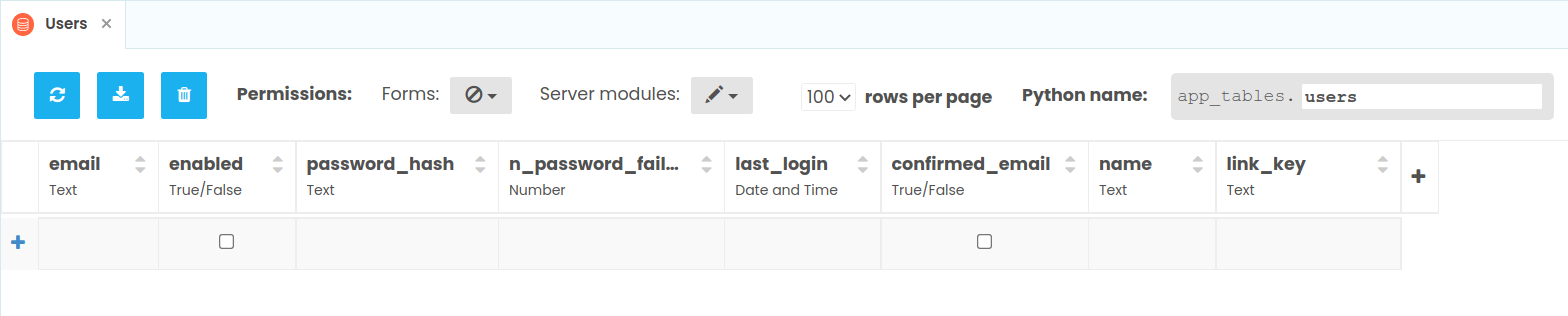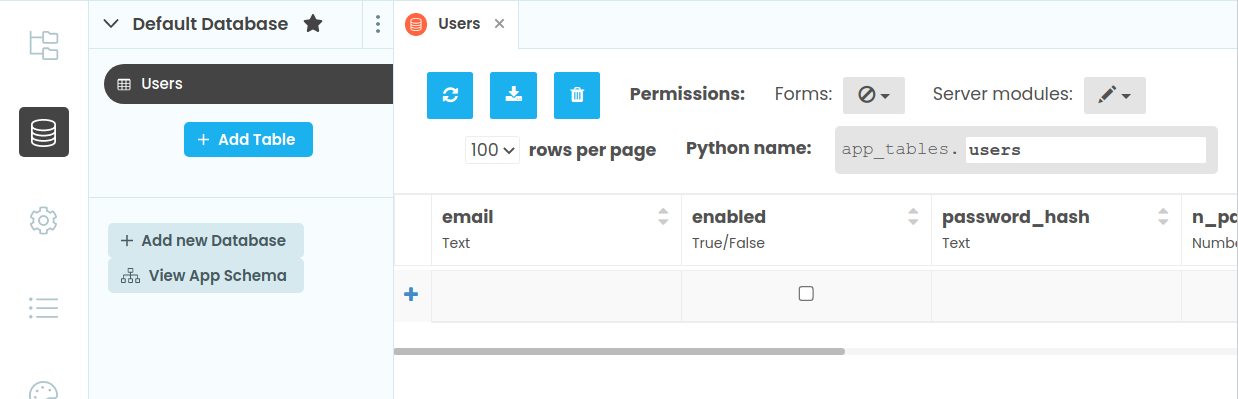 If you open your app’s data tables, you’ll see your app now has a ‘Users’ Table. This is where your app will store login information for each of your users.