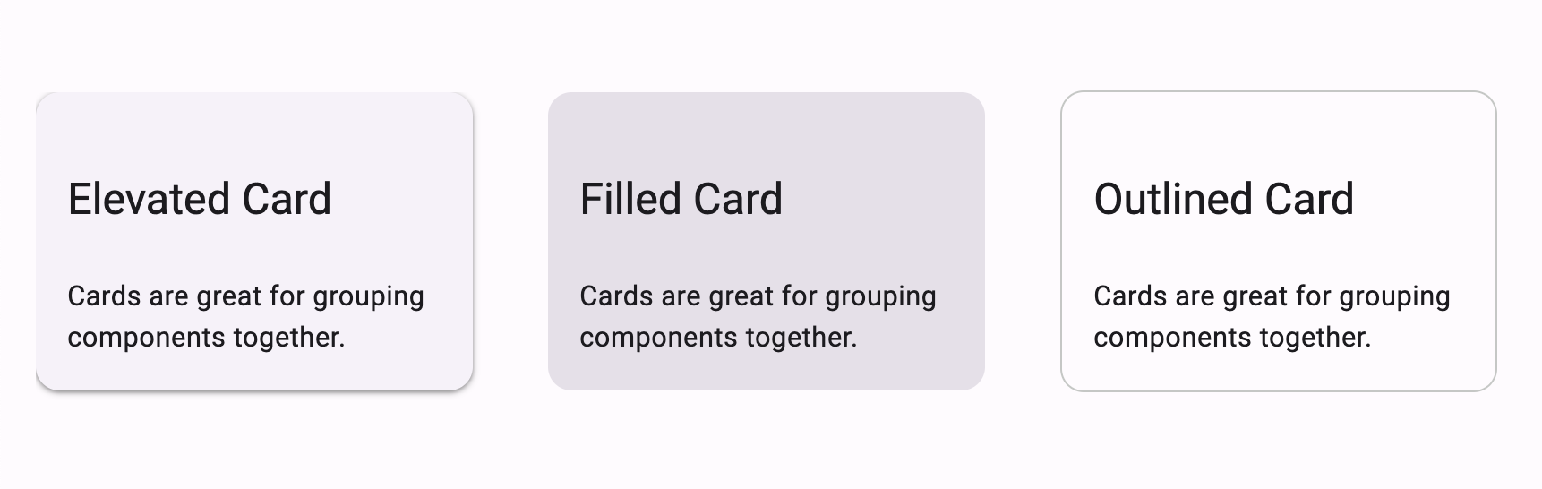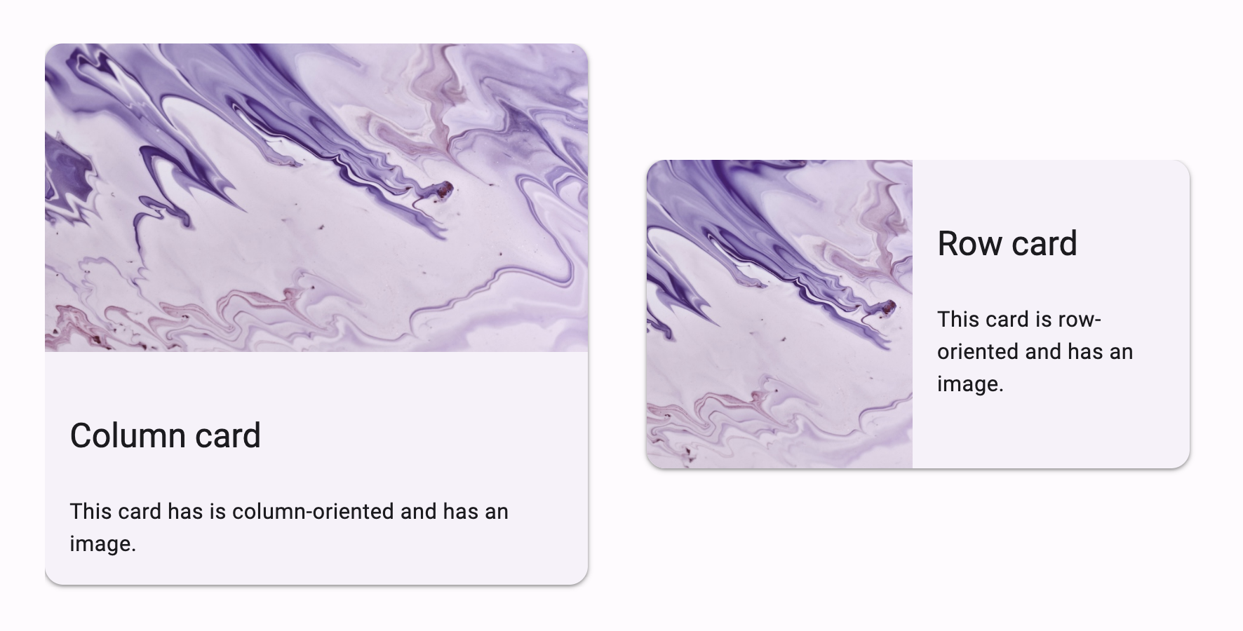 Cards have three predefined appearance options, elevated, filled, and outlined, that can be set from the Properties Panel or in code. Cards also have an orientation property that can be set to row or column. Setting the orientation changes the stacking direction of the components within the Card.