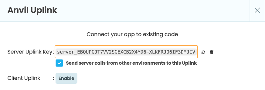 This generates a secret key you will use to connect your external code to your Anvil application.