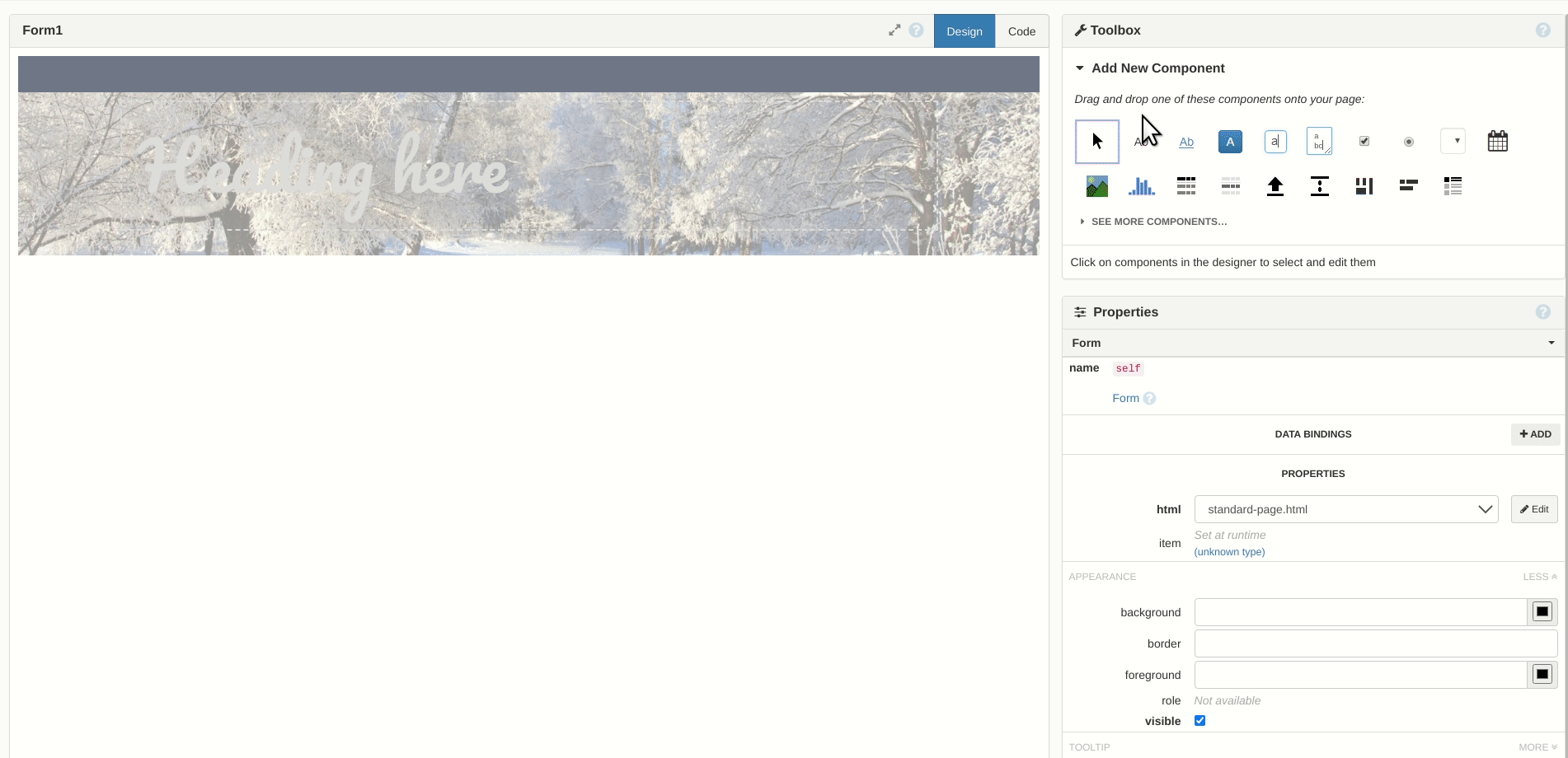 We get started by choosing the ‘Hello San Francisco’ style when creating a new app, and choosing the ‘Standard’ theme for our app page. We replace the header.jpg asset with a suitably wintery image so that our header shows something a little more seasonal than the sweeping skyline of San Fran, and then we’re ready to start building the UI!
