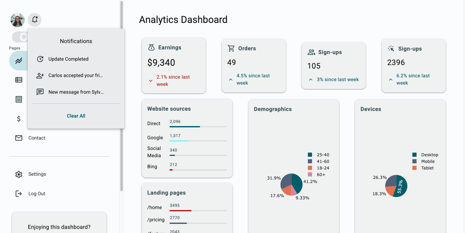 The Admin Dashboard uses the Material 3 design system for a sleek and modern design. Build your own dashboards by dragging and dropping Material 3 components onto the page.