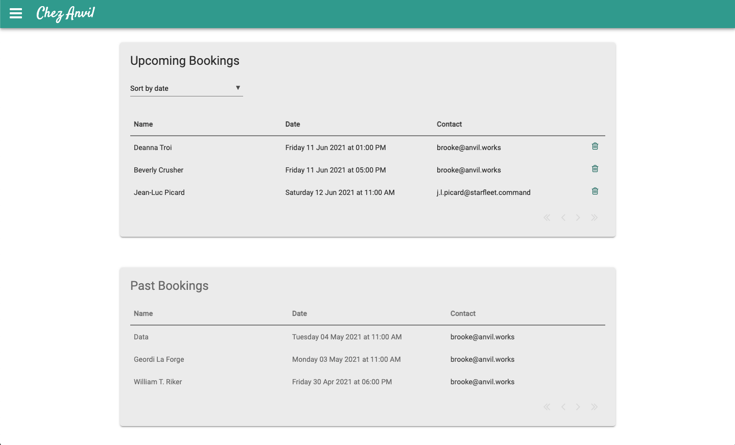 A separate form displays all current and past bookings made by the currently logged in user. If the user is an admin, they can see all bookings made by anyone. Here, users can cancel any upcoming booking and admins can easily email customers regarding their booking. The app automatically emails the user when a new booking is made or when a booking is cancelled.