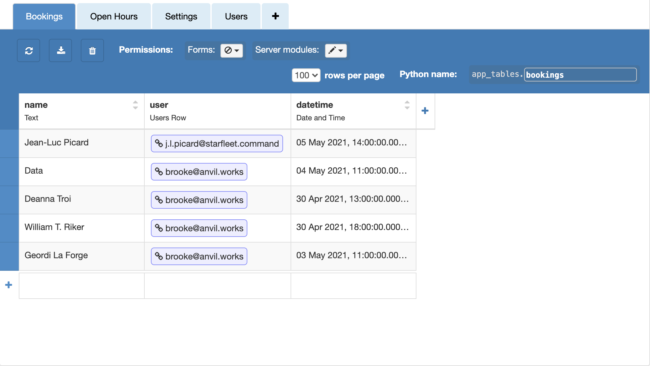 The bookings table stores the chosen datetime object and links to the users Data Table.