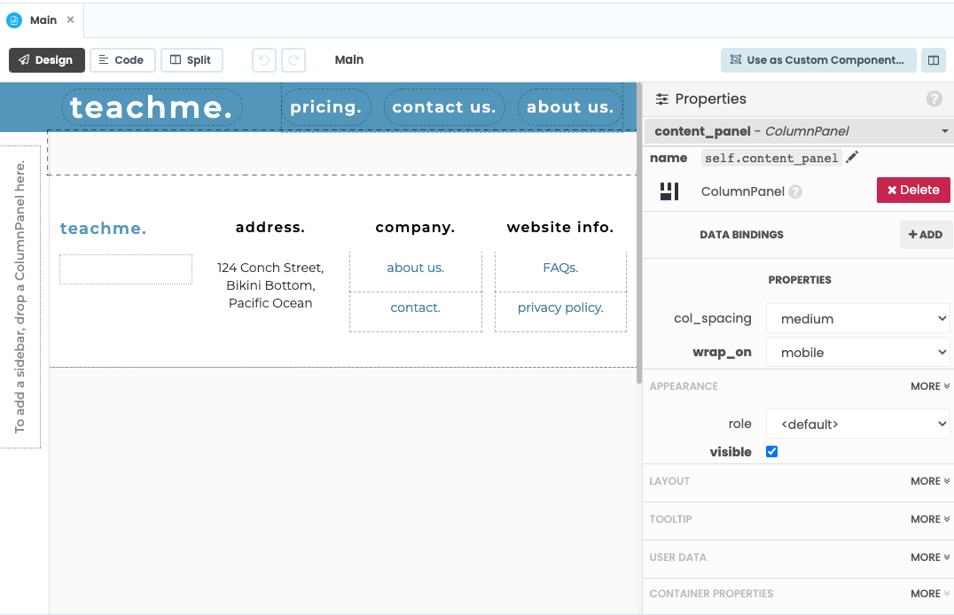 The Main form contains the app bar at the top, an empty ColumnPanel and a Card at the bottom, which acts as a footer containing links and info about the company. The pages of the website are added as components to the empty ColumnPanel. This way, the app bar and footer will be on every page.