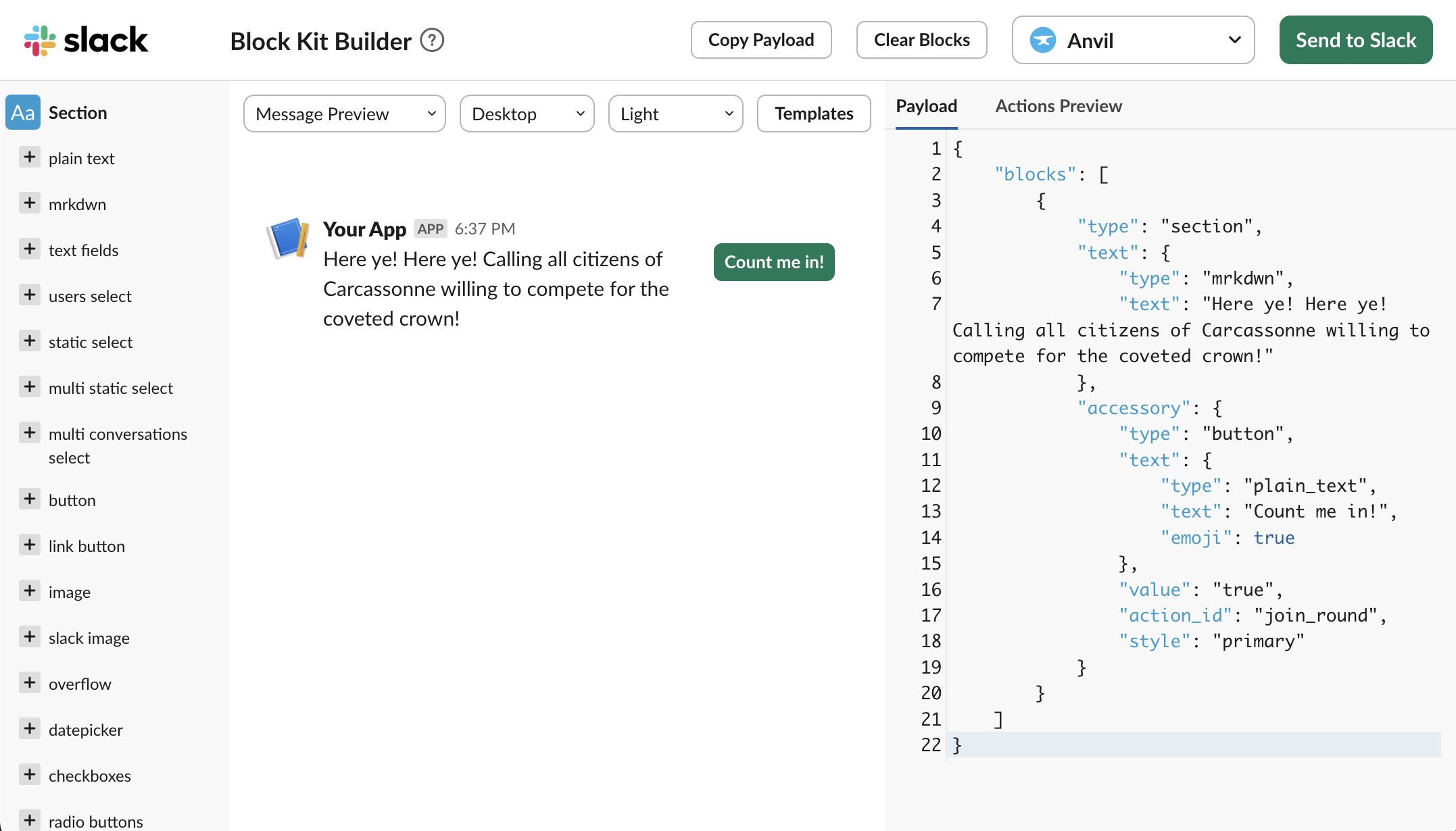So far, our Slack app still doesn’t do anything. Our Anvil app is set up to handle incoming message and interaction requests, and we’ve set up two Data Tables to store information about our players and games. The next thing we need to do is build our User Interface within Slack. We’ll want the app to announce to Slack that a new round of Carcassonne games are about to start, but we should also ask our co-workers if they want to play this round. As we previously agreed, scheduled fun is the best type of fun, but we can also agree that forced fun is the worst type of fun. So we’ll also need a way for co-workers to opt-in to playing each round.