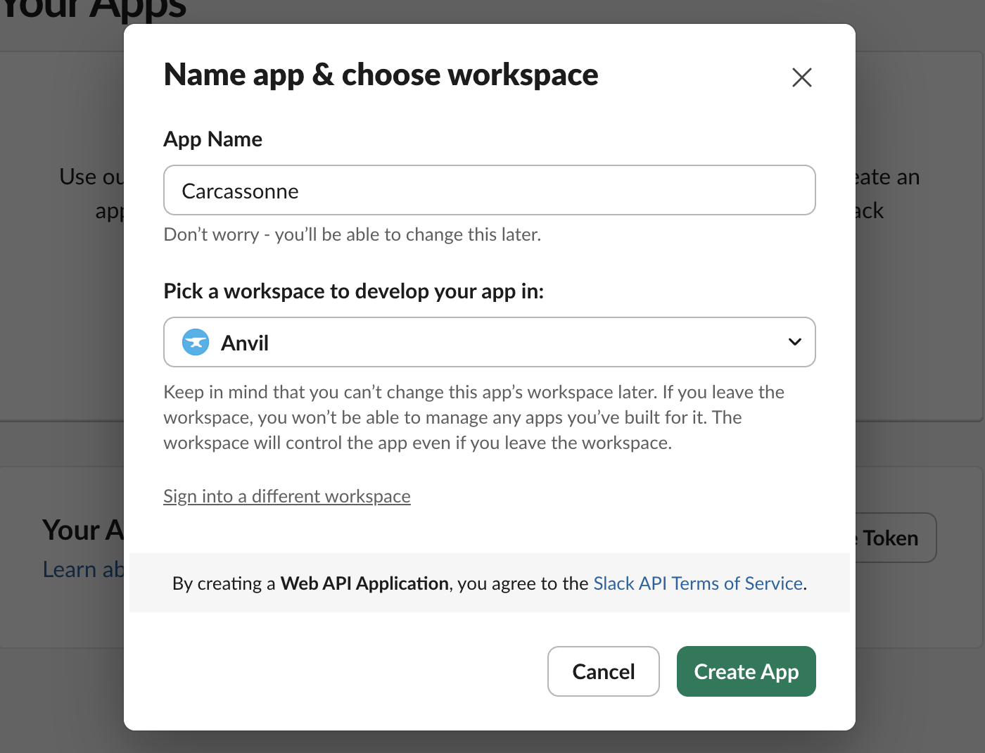The first step is to actually create a new Slack app. Head over to api.slack.com, sign in to your workspace, and click “Create a custom app”. Give it a name, choose your workspace and create your new app.