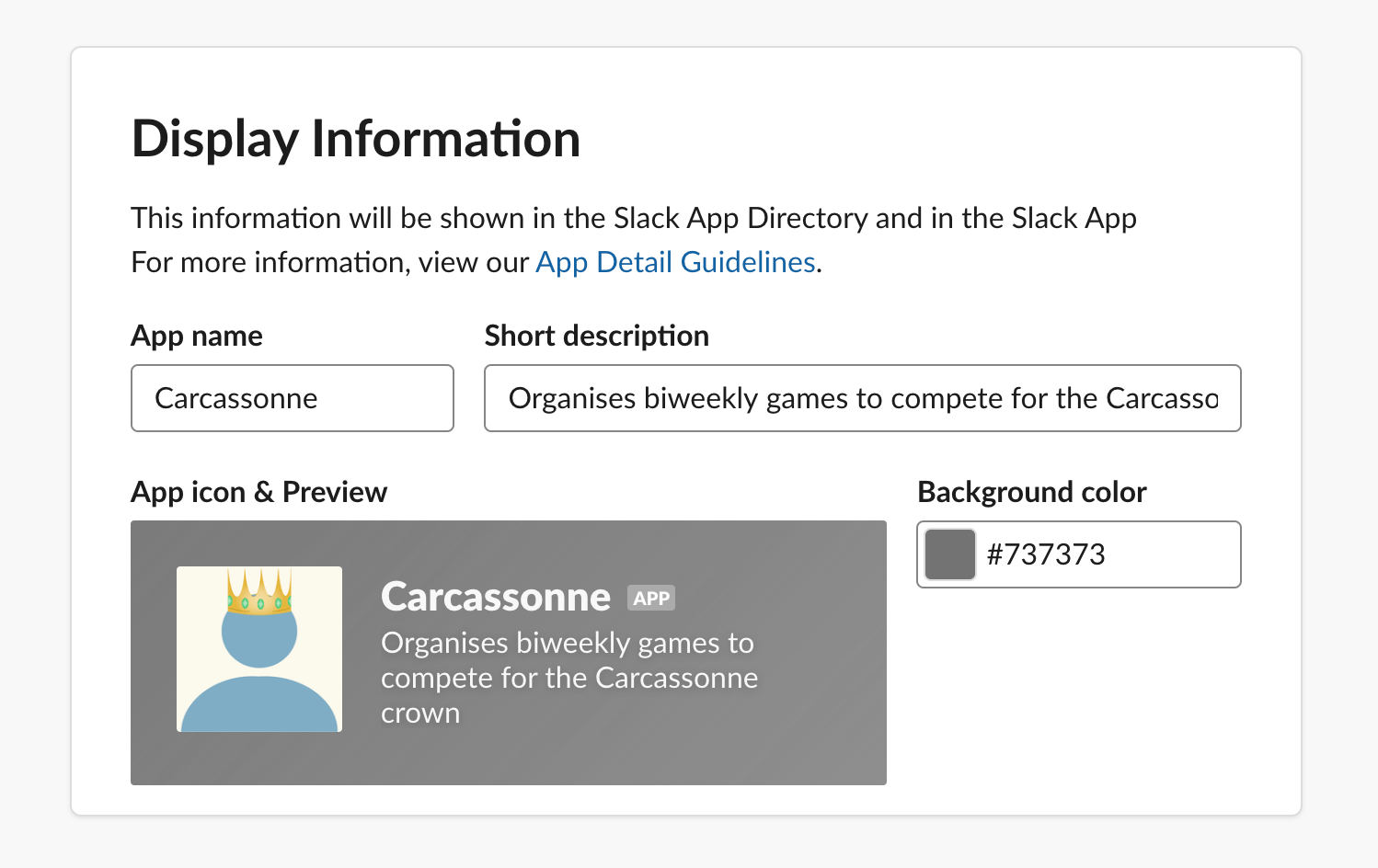 Although big group Zoom calls are hard to navigate, we’ve had great fun playing Carcassonne together at lunchtime. It gives us an endless supply of conversation starters, and because it’s a turn-based game, everyone gets included in the conversation. And as we all know, the only thing more fun than fun is scheduled fun. So I decided to create an app for our Slack workspace that regularly schedules games of Carcassonne. This guide will show you how I did it.