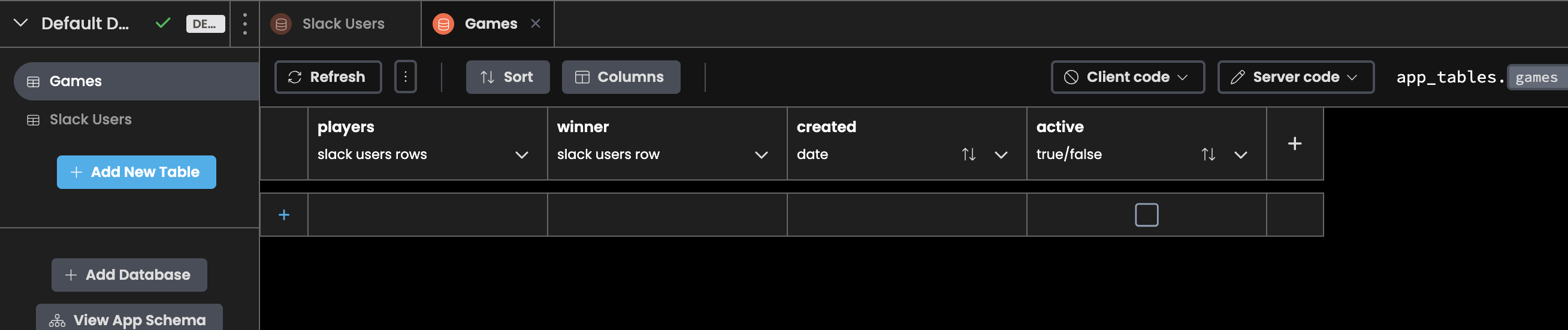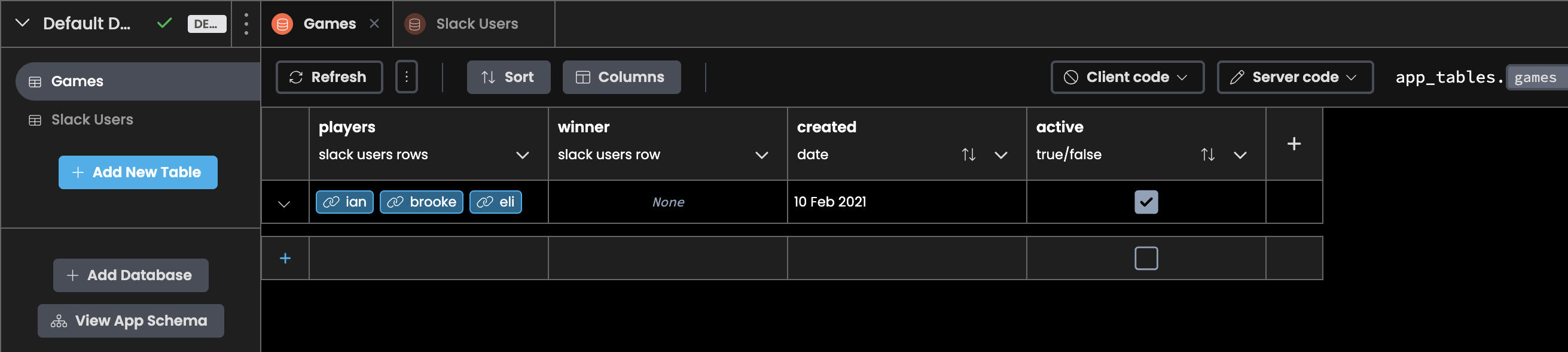 We now have a Data Table with all the possible Carcassonne players. Since we might have more than one game during a single round, we should also create a Data Table of Carcassonne games so we can assign Slack users to the games. This way, we can also store the winner of each game. Add another Data Table to your Anvil app called games with four columns. We need a column called players that links to multiple rows of the slack_users table. We also need a column called winner that links to a single row of the slack_users table. Our table also needs a created column and a True/False column to indicate whether or not the game is currently active.