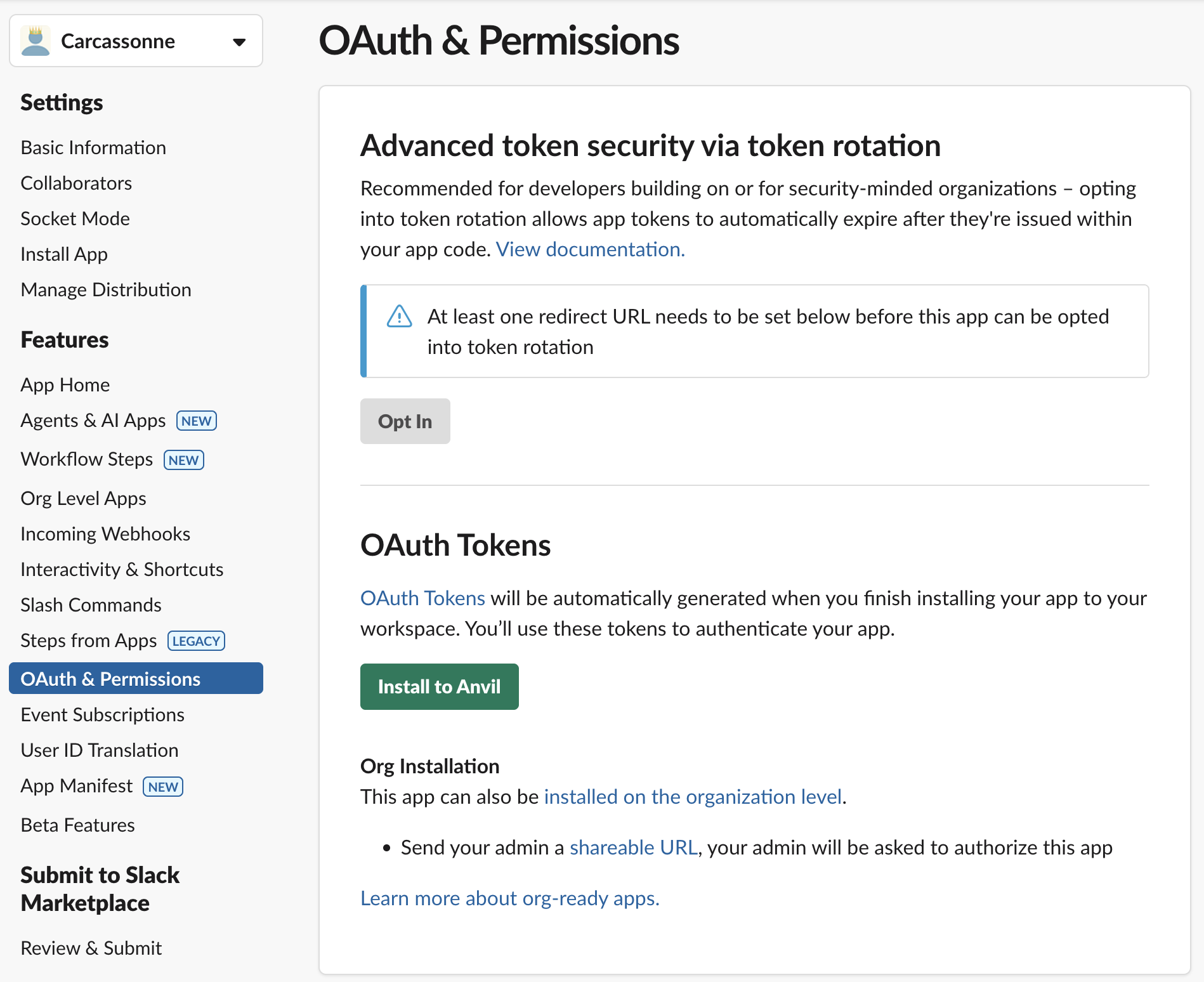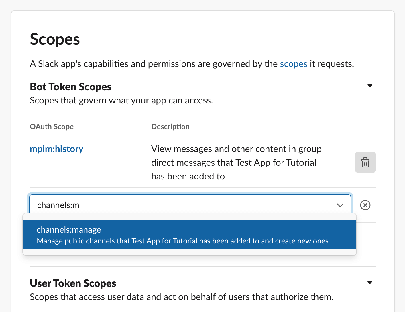 We’ll need a few Bot Token scopes for our Carcassonne bot to work properly: channels:manage, channels:read, chat:write, im:history, groups:write, im:write, mpim:write, incoming-webhook, and users:read. We don’t need any User Token scopes.