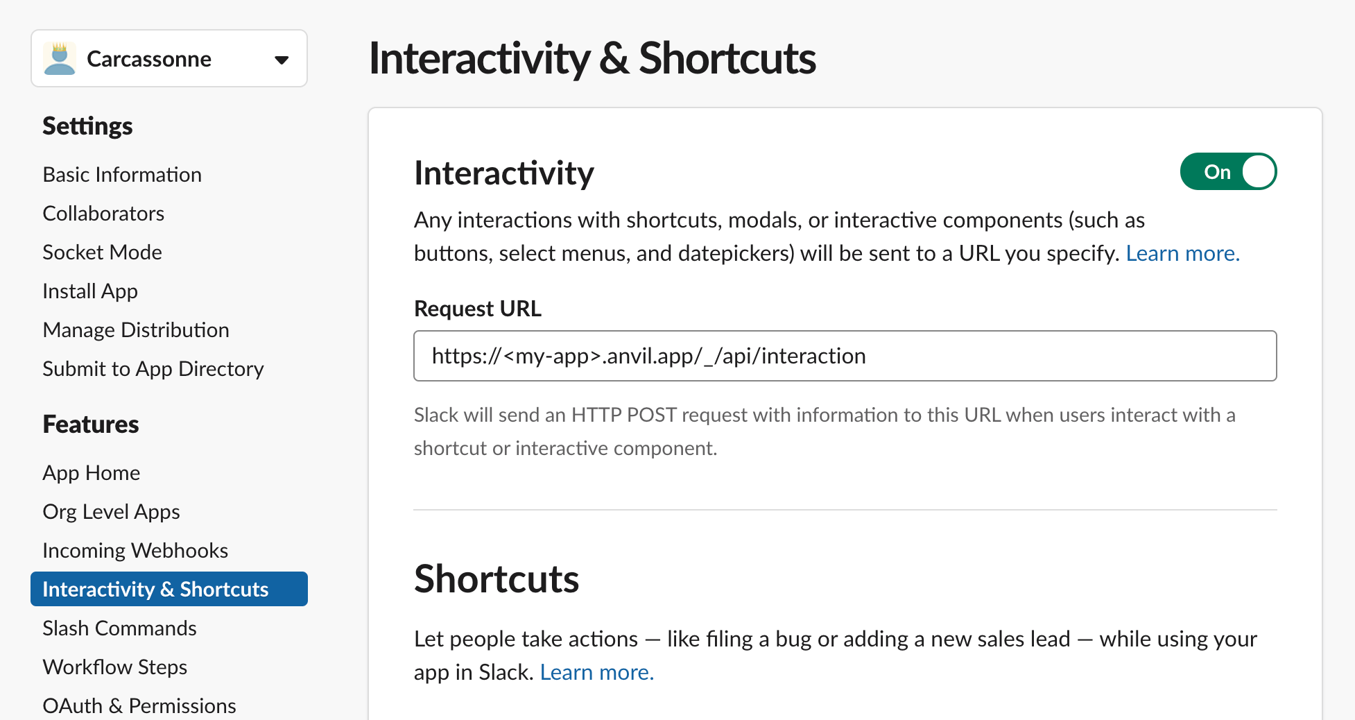 print(payload)We can now enable interactivity in the Slack API. Go to “Interactivity & Shortcuts” in the sidebar and toggle Interactivity to be on. Add your Anvil app’s URL followed by “/_/api/interaction” (or whatever path you provided to the HTTP endpoint). Make sure to save your changes.