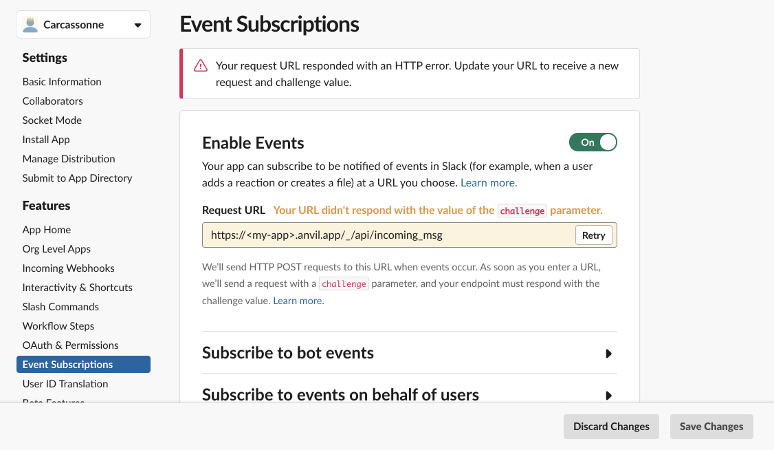 We also want to enable event subscriptions and interactivity, but we’ll first need a URL that Slack can send HTTP POST requests to. In order to do that, let’s set up our Anvil app.