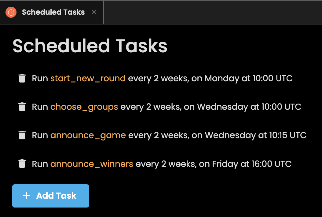 In the Gear menu of your Anvil app, click on Scheduled Tasks. In the popup, add start_new_round as a scheduled tasks and set it to run every 2 weeks (or more or less frequently based on the general level of enthusiasm your team has for Carcassonne). You can then choose what day of the week and the time of the day you want the task to run. Do the same for the other tasks: choose_groups, announce_games, and announce_winners. Make sure to space them out as appropriate.