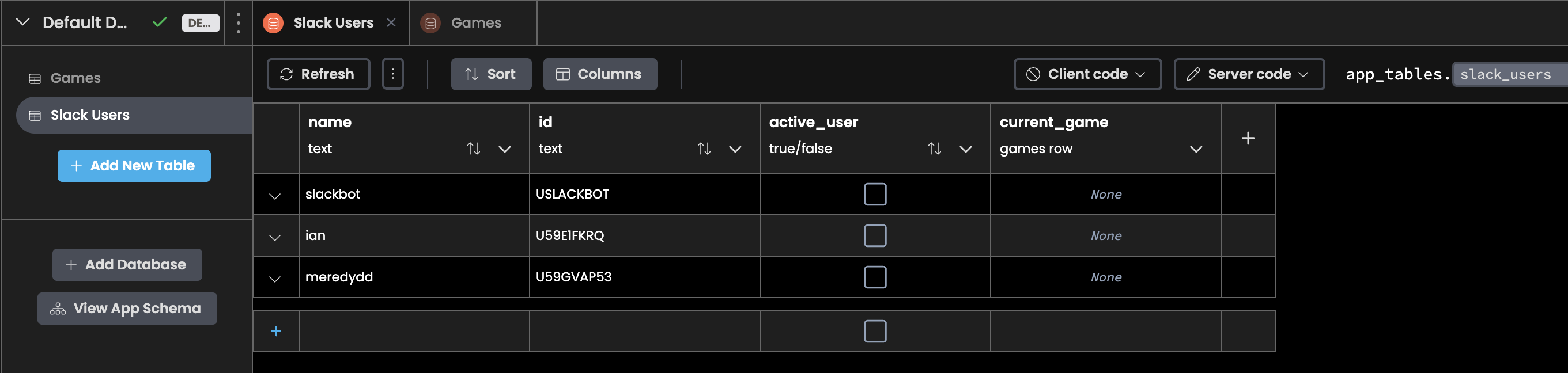 Now that we have a games Data Table, let’s edit our slack_users table to include a column that links back to the games Data Table. That way we can indicate which game each player is currently a part of.