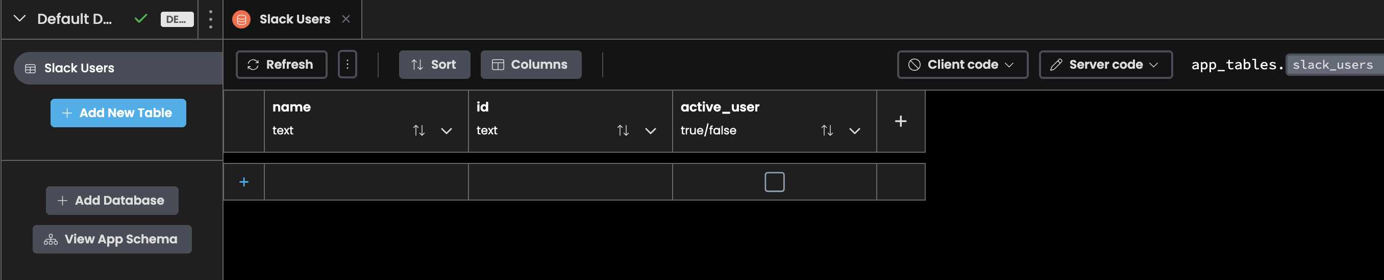 Since we’re building an app to schedule Carcassonne games, the first thing we need is a database of eligible players. Let’s create an empty Data Table with a column for the player’s name, their Slack User ID and a column indicating whether or not they will be playing Carcassonne this round. Let’s name this Data Table slack_users.