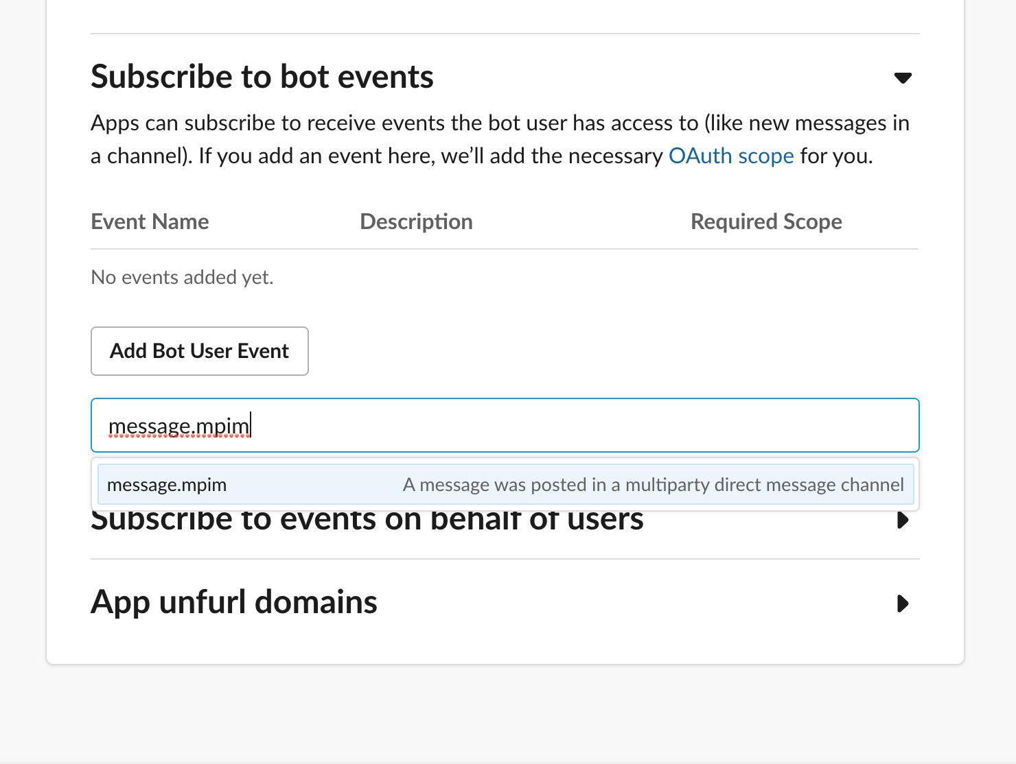 return incoming['challenge']Go back to “Event Subscriptions” in the Slack API, enable events again and re-add the request URL. This time, the URL should be verified. Without leaving the page, we should now subscribe to bot events. For the Carcassonne app we are building, we only need message.mpim. This allows the app to read messages in a DM - we’ll see later why we want this. Make sure to click “Save Changes” at the bottom of the page and reinstall the slack app to your workspace.