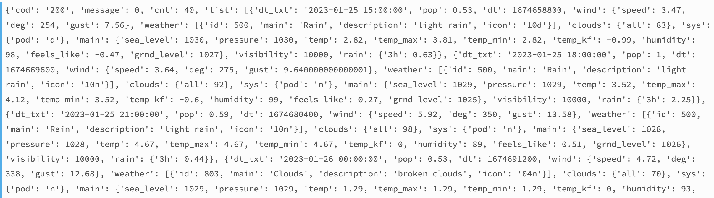 #print the output from the OpenWeatherMap API