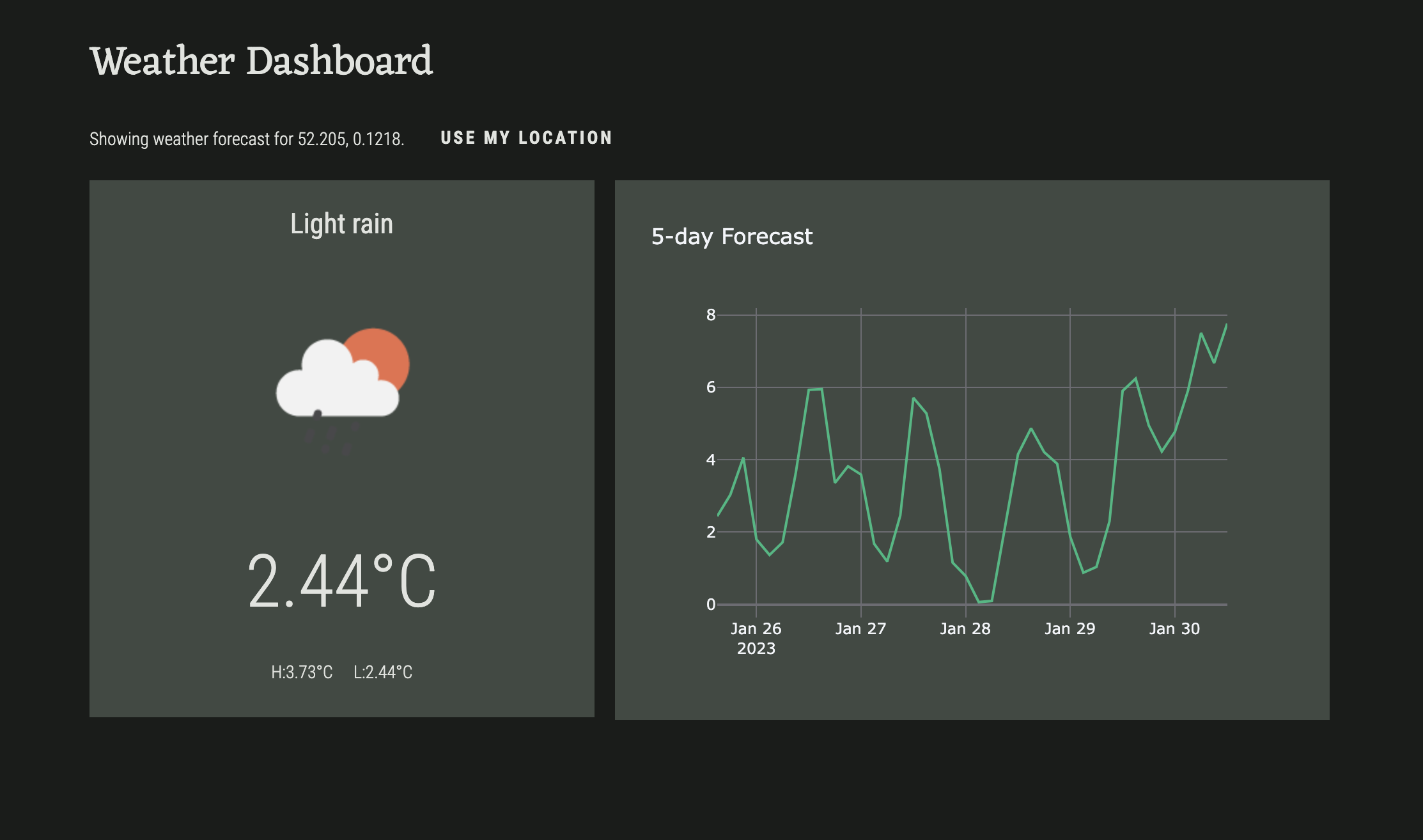 self.icon.source = f"https://openweathermap.org/img/wn/{summary_data['icon']}@4x.png"Run your app. This is what the dashboard should look like when running it: