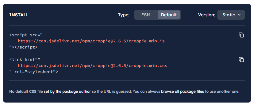 According to the Croppie documentation, we need to include both the Croppie Javascript and CSS file. Go to JSDELIVR and search for Croppie. The first result will take you to the JSDELIVR page for Croppie. On that page you’ll see this box: